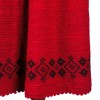 Το ένδυμα αποτελείται από χειροποίητο πλεκτό φόρεμα σε έντονο κόκκινο χρώμα, φτιαγμένο με πυκνή πλέξη “ποδαράκι” (διπλό βελονάκι), η οποία δημιουργεί ομοιόμορφη και σταθερή επιφάνεια με ελαφριά ελαστικότητα. Στο κάτω μέρος του φορέματος διακρίνεται οριζόντια ζώνη διακόσμου με γεωμετρικά μοτίβα σε μαύρο χρώμα, σχηματισμένα με την τεχνική της αλλαγής νήματος μέσα στο πλεκτό, ενώ το τελείωμα φέρει οδοντωτό μπορντούρα (picot), χαρακτηριστική λεπτομέρεια των παραδοσιακών πλεκτών. Η λαιμόκοψη σχηματίζει βαθύ V, ενώ το πάνω μέρος (μπούστο) είναι πλεγμένο με κάθετη φορά, διαφοροποιώντας τη δομή από το υπόλοιπο ένδυμα και προσδίδοντας καλύτερη εφαρμογή. Το φόρεμα φοριέται πάνω από λευκό βαμβακερό πουκάμισο με μακρύ μανίκι. Το ένδυμα αποτελεί δείγμα γυναικείας ενδυμασίας των Τζουμέρκων, με πλεκτή κατασκευή αντί για υφαντό, κάτι που το καθιστά πιο εύκαμπτο και πρακτικό για την ορεινή καθημερινότητα, αλλά ταυτόχρονα διατηρεί αισθητικά στοιχεία γιορτινής εμφάνισης χάρη στο έντονο κόκκινο χρώμα και τη μαύρη διακόσμηση.