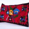 Υφαντή μαξιλάρα με κόκκινο κάμπο, μαύρο περίγραμμα και σχηματοποιημένα λουλούδια (τριαντάφυλλα) σε πορτοκαλί και γαλάζιο χρώμα. Οι μαξιλάρες ήταν αντικείμενα και χρηστικά και διακοσμητικά. Εκεί ακουμπούσαν όσοι κάθονταν στα μιντέρια, τους καναπέδες της εποχής, για να μην ακουμπούν στον υγρό τοίχο αλλά και για να είναι πιο αναπαυτικά. Επίσης σε αυτές κάθονταν στο πάτωμα όσοι ήθελαν να φάνε γύρω από το σοφρά, το χαμηλό τραπέζι. Οι υφάντρες φρόντιζαν να τις κάνουν πολύχρωμες, με πλουμιστά σχέδια, για να στολίζουν και το σπίτι όμορφα.