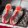 Μάλλινες υφαντές παντόφλες λευκές με κόκκινες ραφές, γαλάζια διακοσμητικά σχηματοποιημένα λουλούδια με βελονιά και κοκκινωπή φούντα.