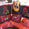 Διάφορα υφαντά που καλύπτουν τους τοίχους και τη μπασκιά, δημιουργώντας μια παραδοσιακή "γωνιά" στην κεντρική αίθουσα του μουσείου. Αποτελούνται από δύο επιτοίχιες πάντες μαύρες με κόκκινη περίμετρο και κόκκινα λουλούδια στο κέντρο, κόκκινα-μπεζ ριγέ μάλλινα κιλίμια στο μεντέρι και υφαντές μαξιλάρες με κόκκινο κάμπο και γεωμετρικά σχέδια ή σχηματοποιημένα λουλούδια και πουλιά.