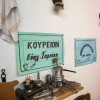 Διάφορα αντικείμενα που χρησιμοποιούσαν οι κουρείς στα κεφαλοχώρια των Τζουμέρκων. Στην πίσω σειρά από αριστερά προς τα δεξιά βλέπουμε μια δερμάτινη ζώνη για το ακόνισμα των λεπίδων, δοχείο αρώματος, βούρτσα για την απομάκρυνησ των τριχών από τα ρούχα, μικρό δοχείο για τις πομάδες, βούρτσα με μακριά τρίχα για καθάρισμα του αυχένα. Στην κάτω σειρά, κουρευτικές μηχανές (η περιβόητη "ψιλή" με την οποία έκοβαν τα μαλλιά των στρατεύσιμων αλλά και των μαθητών πολύ κοντά), ψαλίδι και δοχείο σαπουνάδας με το πινέλο. Στον τοίχο η επιγραφή "Κουρείο Ευάγγ. Χαμπίπη-Ρίζου" για να δηλώσει τον δωρητή.